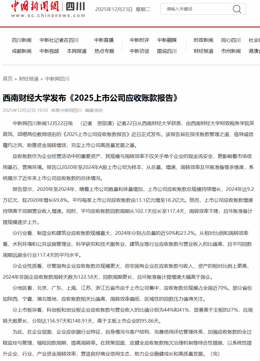 由太阳成集团tyc234cc吴君凤、邱煜两位教师领衔,资产评估硕士生郑晓莹、王一晗、战玉佳、薛雯丽合作编撰的《2025上市公司应收账款报告》发布。该报告旨在探求账款管理之道,倡导诚信履约之风,助推资金周转增效,夯实上市公司高质量发展之基。