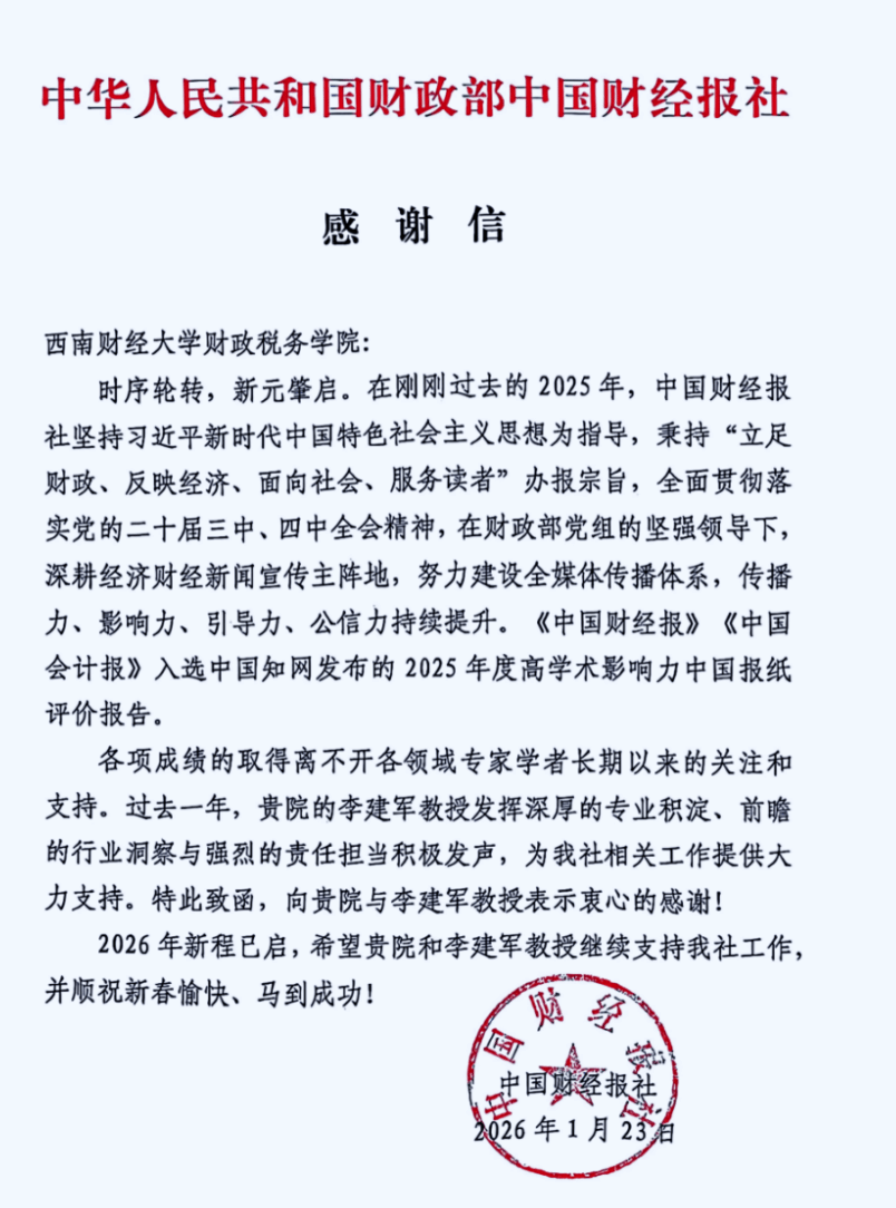 近日,财政部中国财经报社向太阳成集团tyc234cc发来感谢信,对公司在过去一年中给予的大力支持表示衷心感谢,并致以新春问候。