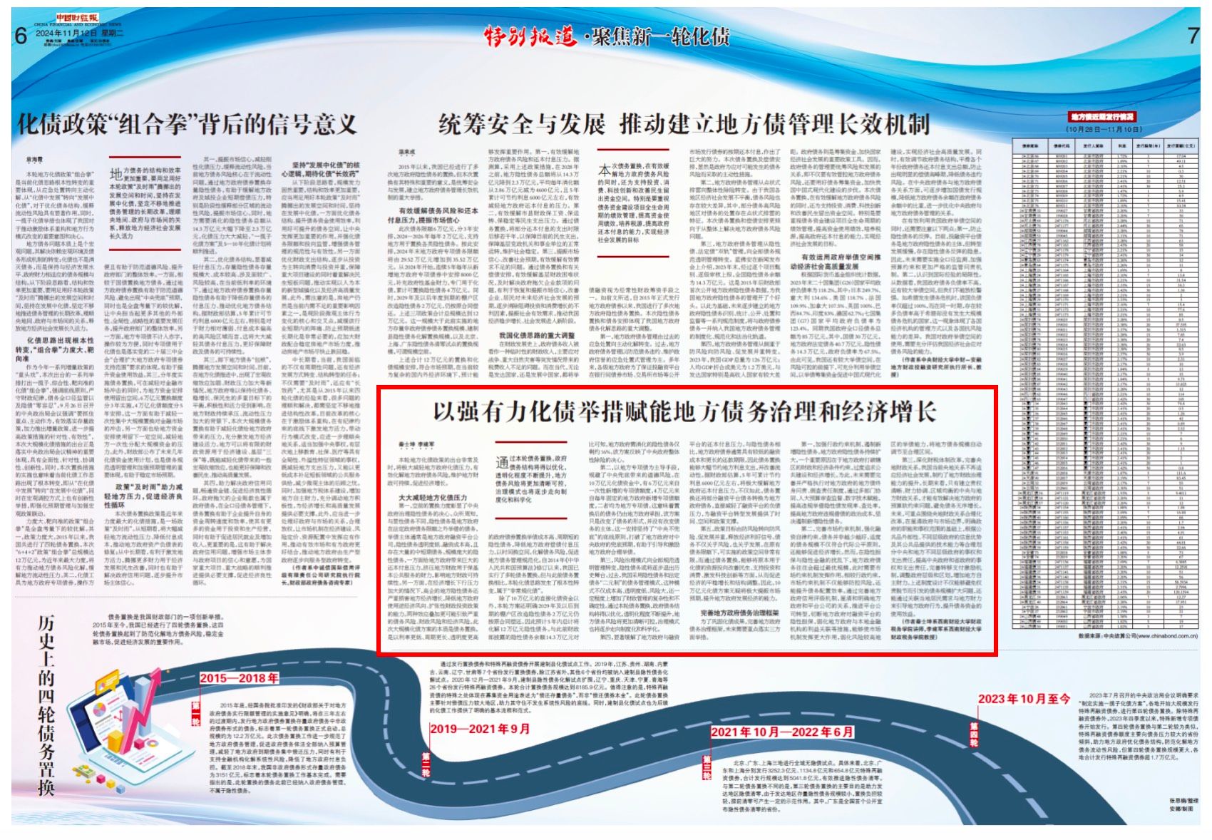2024年11月8日,十四届全国人大常委会表决通过了《国务院关于提请审议增加地方政府债务限额置换存量隐性债务的议案》,这一部署提出将直接增加地方化债资源10万亿元。公司秦士坤讲师和李建军教授在《中国财经报》2024年11月12日版发表文章“以强有力化债举措赋能地方债务治理和经济增长”,阐释地方政府债务治理路径。