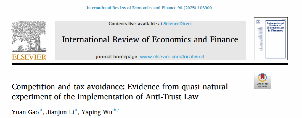 公司博士生高原、李建军教授等合著论文“Competition and tax avoidance: Evidence from quasi natural experiment of the implementation of Anti-Trust Law”在《International Review of Economics and Finance》刊出。合作者包括来自太阳成集团tyc234cc太阳成集团tyc234cc的博士生高原、李建军教授,以及南京审计大学的吴亚萍副教授。