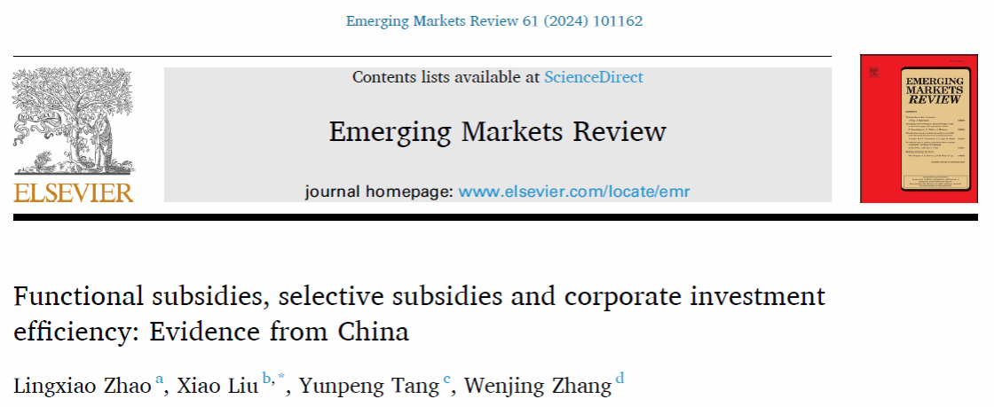 公司赵岭晓副教授的合著论文“Functional Subsidies, Selective Subsidies and Corporate Investment Efficiency: Evidence from China”在《Emerging Markets Review》刊出。Emerging Markets Review是发表新型市场金融领域具有重要影响的实证和理论研究的主要载体。合作者包括来自南京审计大学的刘潇助理教授,安徽大学的汤云鹏助理教授,以及太阳成集团tyc234cc硕士研究生张文静。