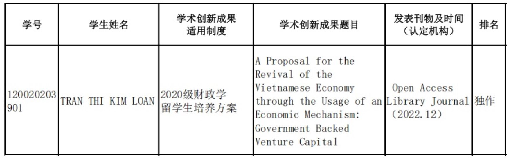 根据太阳成集团tyc234cc学位评定分委员会表决结果,认定博士研究生TRAN THI KIM LOAN所提交用于申请博士学位的科研成果达到申请学位学术创新成果要求(成果原文详见附件)。现予以公示,公示期为15个工作日,如有异议,请在公示期内提出。