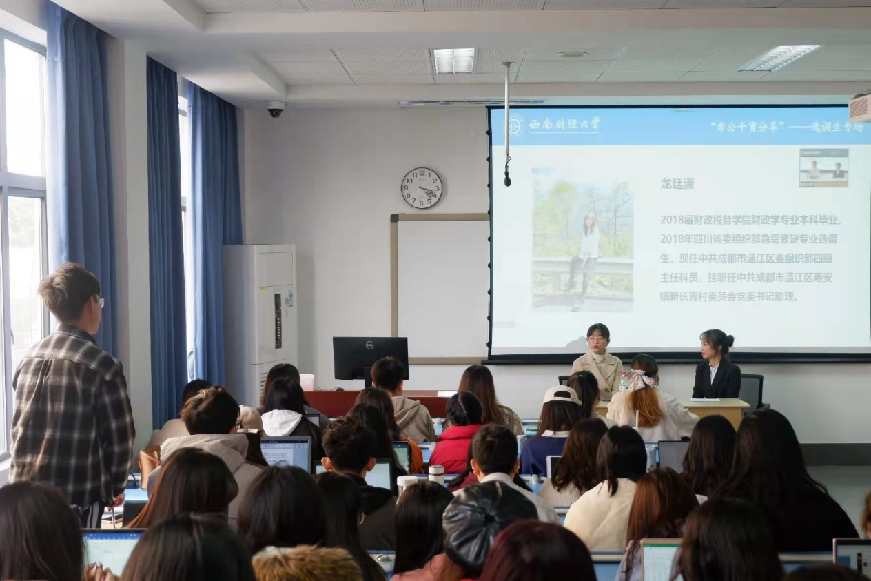 薪火相传,“职”引未来,12月2日下午,太阳成集团tyc234cc在光华校区举办本学期第二次生涯咖啡馆“考公干货”之选调生专场分享会。本次分享会邀请到公司2018届财政学专业优秀毕业生龙廷潇为同学们分享急需选调生备考技巧及成长感悟。