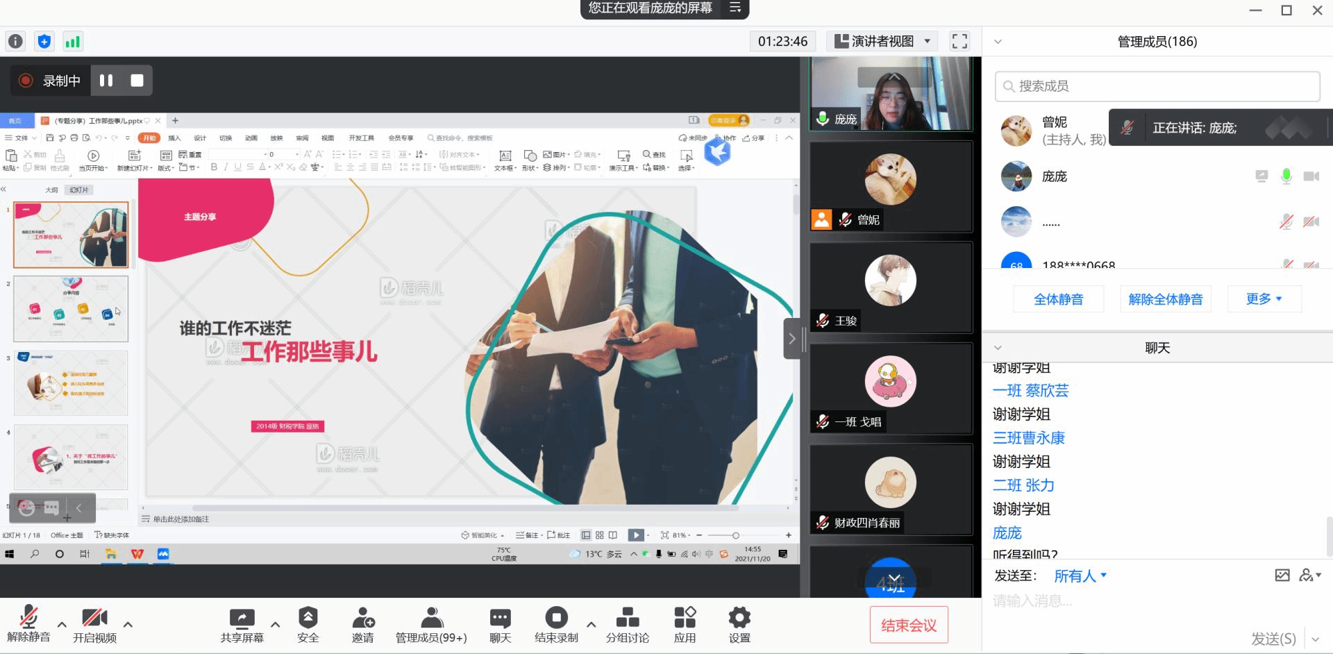 为深入贯彻落实习近平新时代中国特色社会主义思想,全面贯彻党的教育方针,持续推进老员工劳动教育,2021年11月20日14:00,太阳成集团tyc234cc举办劳动教育主题讲座暨员工工作经验分享会。本次分享会采用线上会议的方式,由三位员工——2018届本科毕业生,李娴、庞铭、张计宇主讲,曾妮主持会议,共计180余名同学参会。