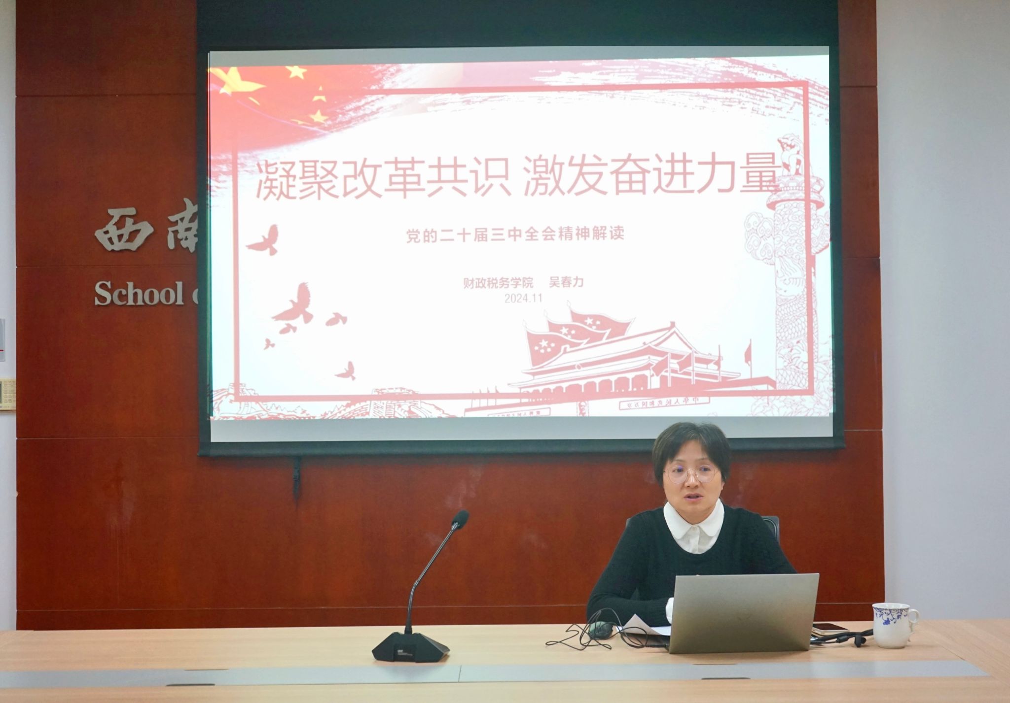 2024年11月8日下午,公司党委书记吴春力在柳林校区格致楼811会议室为博士研究生、税收科硕研究生讲授专题思政课,主题为“凝聚改革共识,激发奋进力量——党的二十届三中全会精神解读”。