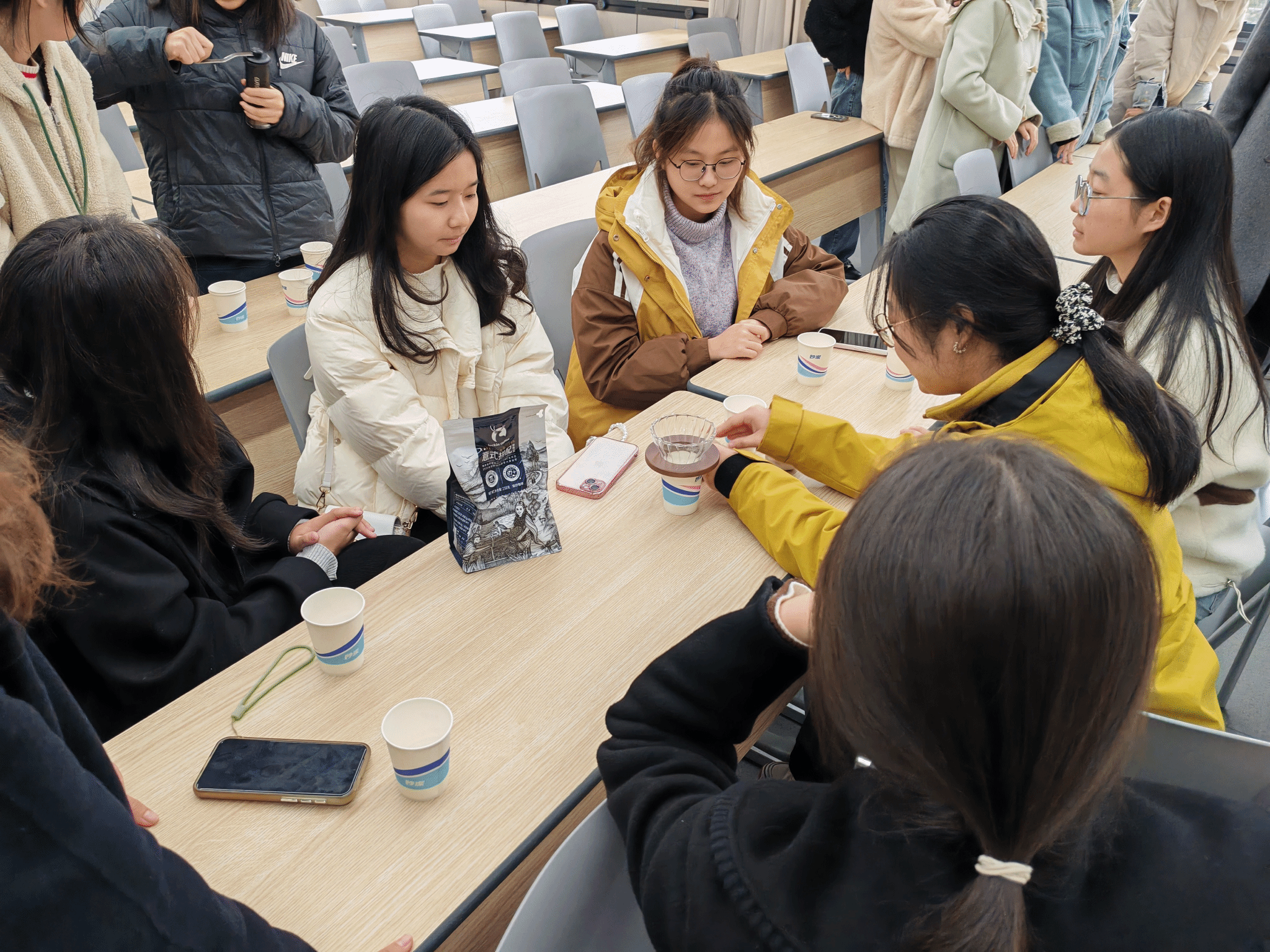 活动现场,工作室成员王馨竹和梁嘉茜为大家详细讲解了咖啡文化及冲泡技巧。此外,现场还准备了椰汁、牛奶、橙汁等饮品供同学们制作不同风味的咖啡。同学们热情高涨,纷纷亲手尝试冲泡咖啡,享受制作过程中的乐趣。