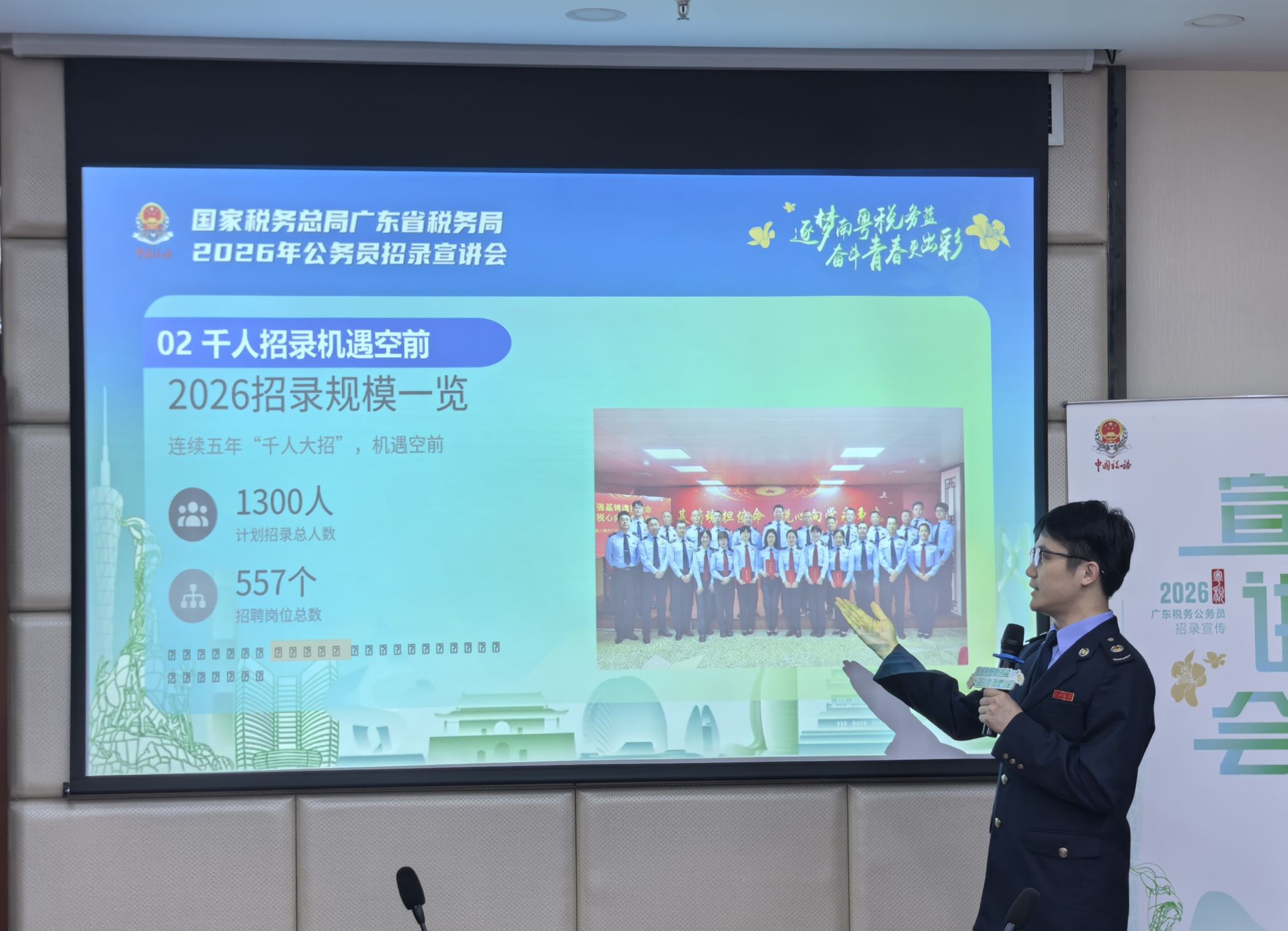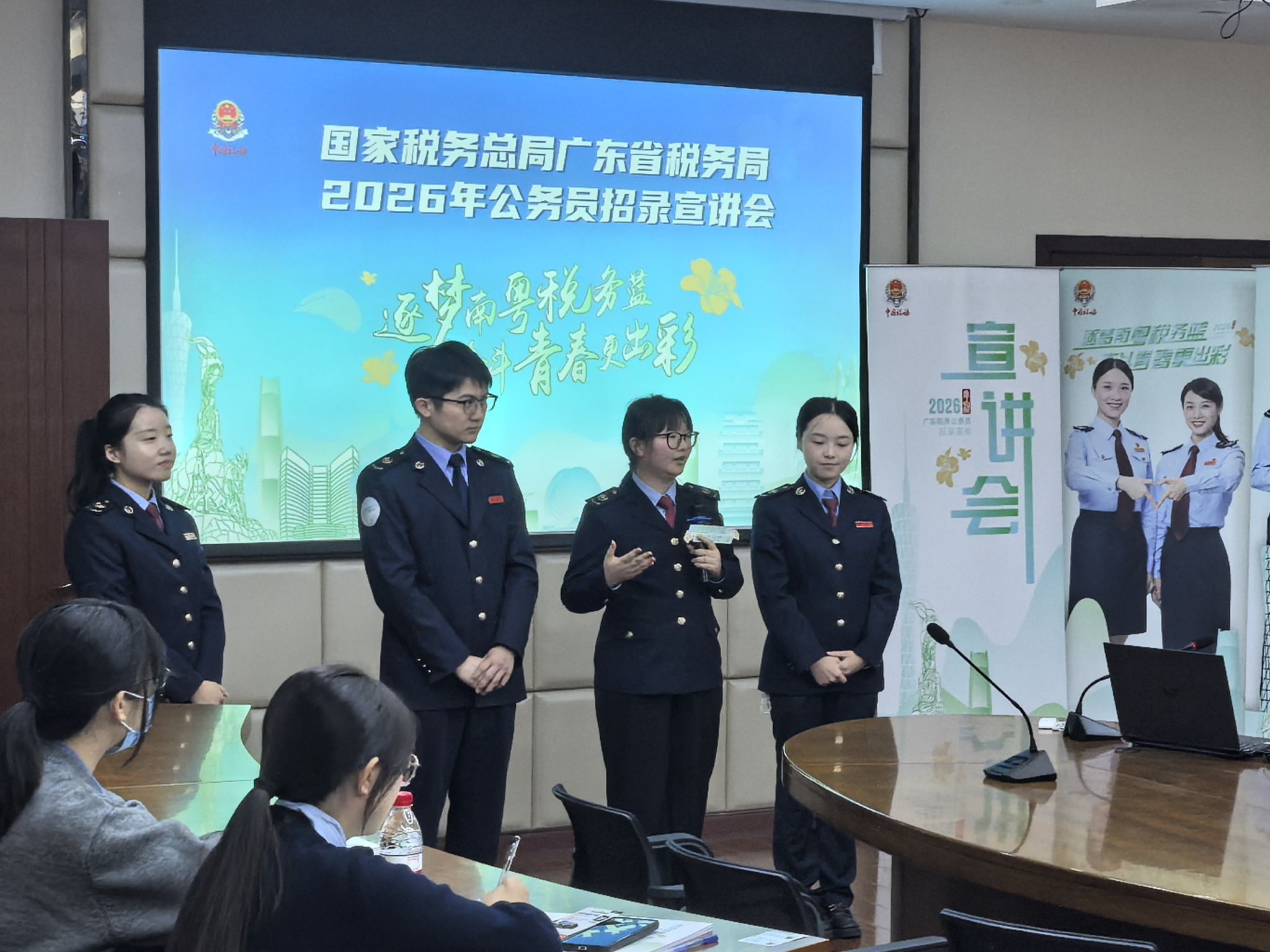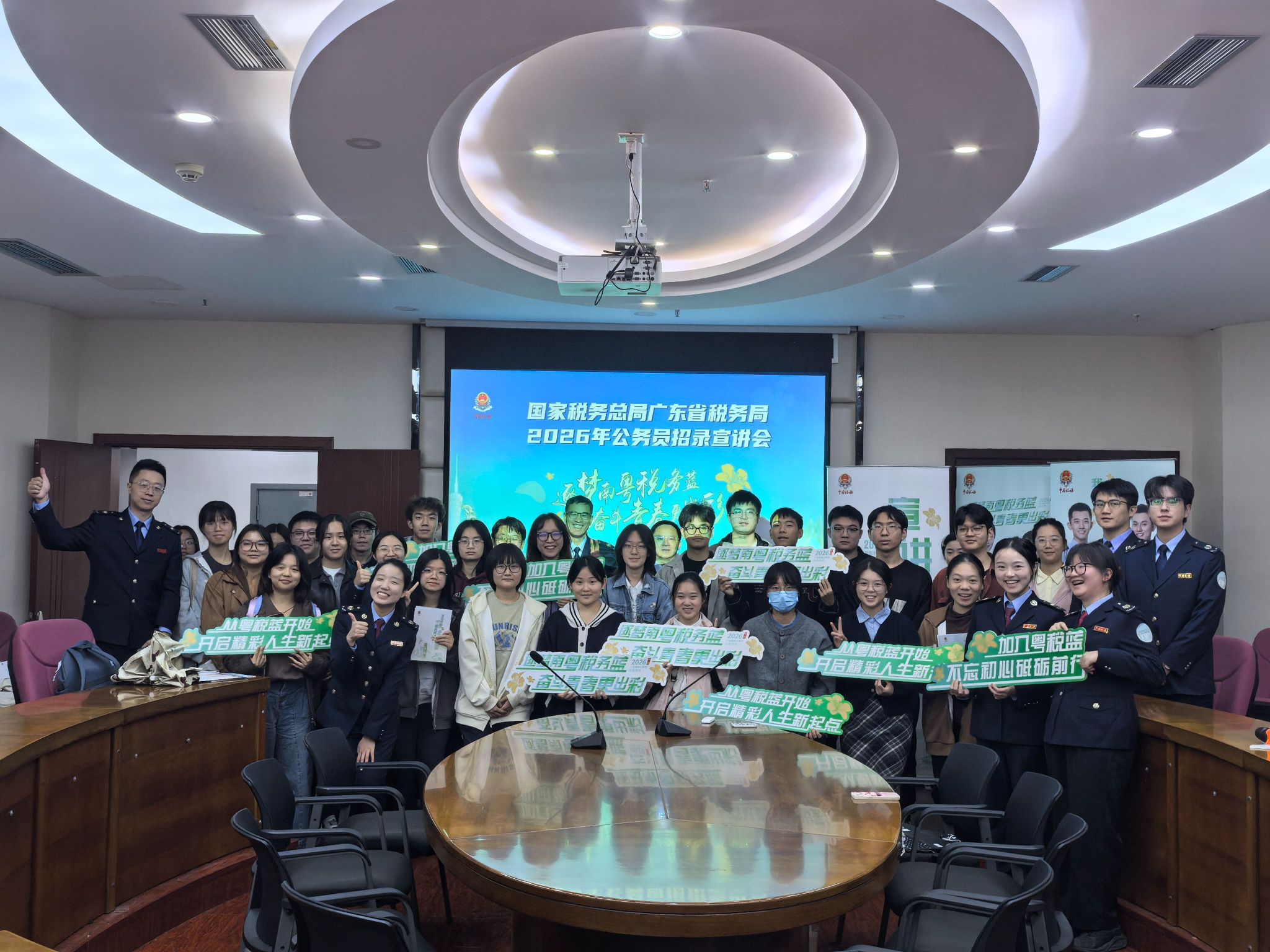 2025年10月21日,国家税务总局广东省税务局携手太阳成集团tyc234cc,于柳林校区格致楼918会议室成功举办2026年公务员招录宣讲会。活动搭建了在校同学与税务部门直接沟通的桥梁,增进了同学们对国家税收工作的系统认知与职业认同,也为同学们未来职业选择提供了有益参考。