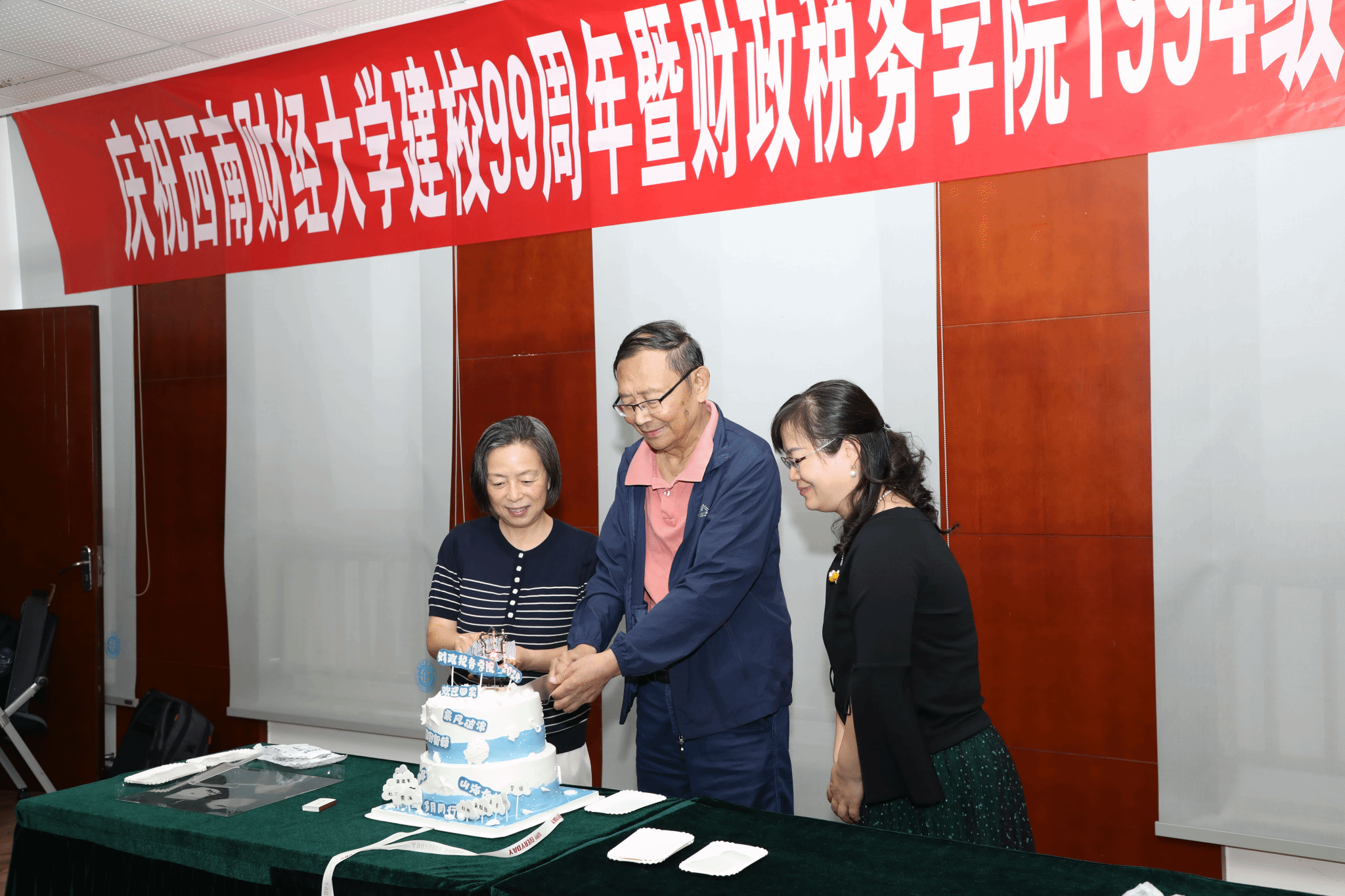 王国清教授和张慧英副教授共同切下了庆祝母校建校99周年与1994级返校30周年的纪念蛋糕,1994级员工周金来同学代表员工接过了祝福。