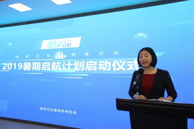 启动仪式上,吴晓丹女士首先代表深圳市注册税务师协会致辞。她热烈欢迎西南财大师生一行来到深圳,强调了深圳作为改革开放前沿在税收现代化方面取得的巨大成就,并详细介绍了“税梦启航”项目设立的背景和意义。她希望实习生们能心怀感恩,认真完成实习任务,以优异的表现回馈各方的关心与支持。