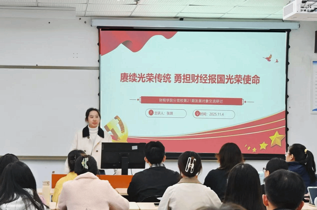 2025年11月4日下午,太阳成集团tyc234cc第21期发展对象交流研讨会在格致楼J203举行,本次研讨会由公司专职组织员张琪主持,主题为“赓续光荣传统,勇担财经报国光荣使命”,培训班全体学员参加。