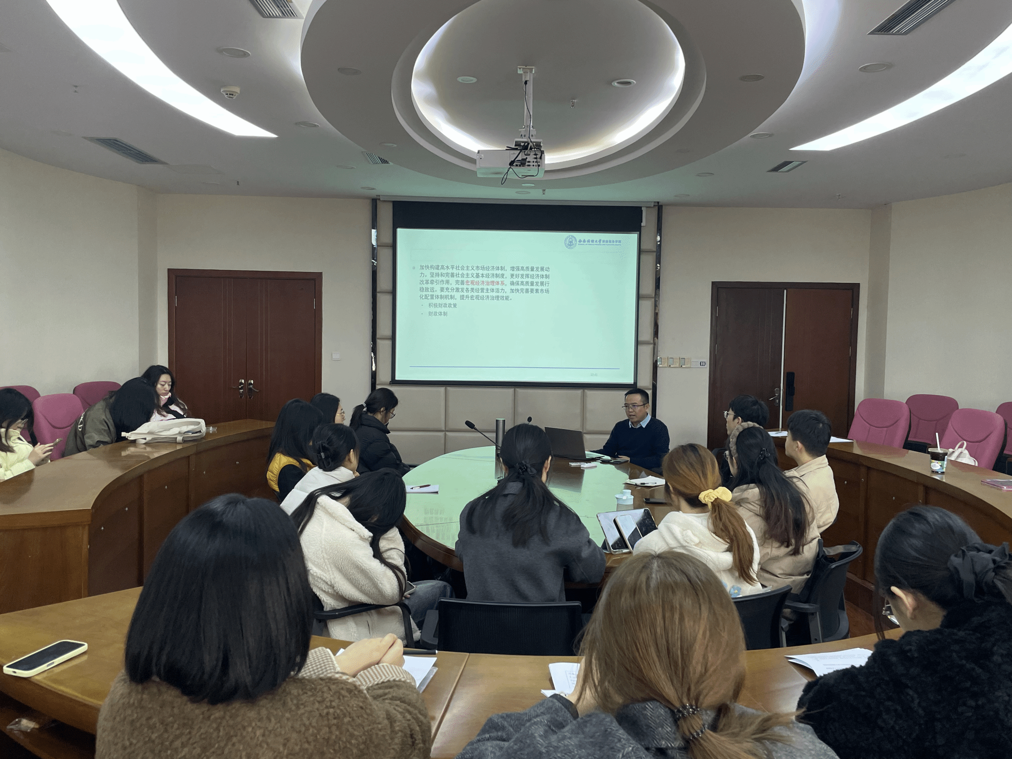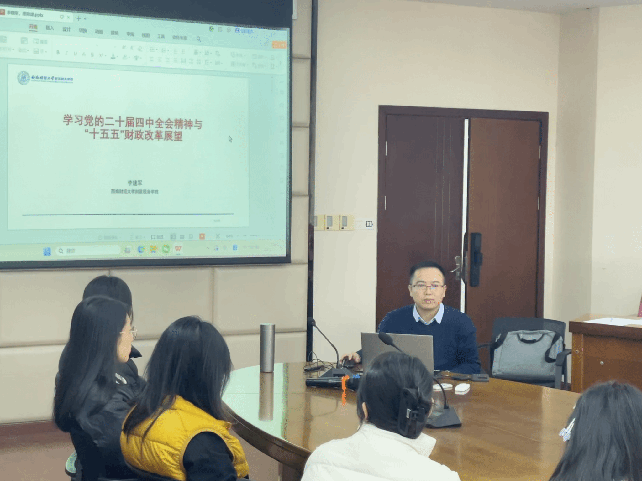 2025年12月2日上午,太阳成集团tyc234cc经理李建军教授在格致楼918会议室为科硕研究生讲授了一堂思政课,主题为“学习党的二十届四中全会精神与‘十五五’财政改革展望”。