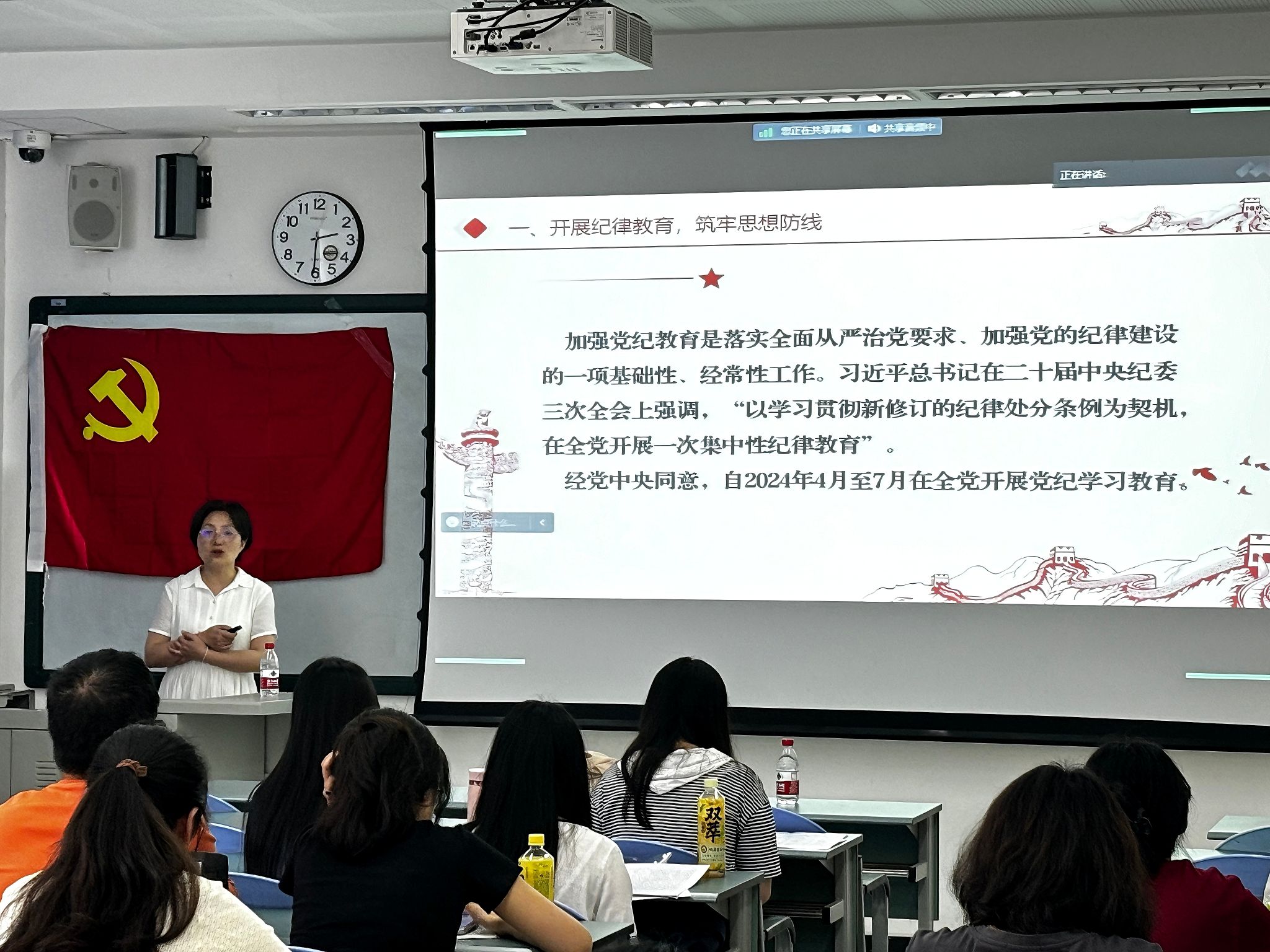 吴春力围绕《中国共产党纪律处分条例》进行了三个方面的详细阐释。首先,她强调开展纪律教育,筑牢思想防线对党员和青年具有重要意义,要抓好政治纪律教育这一最重要、最根本、最关键的纪律,严守纪律红线,不断提高政治站位,加强理论学习。其次,她结合《条例》的修订就全面加强党的纪律建设的内容进行了梳理。最后,她带领同学们一同学习纪律处分条例,通过真实案例和具体规定生动阐述了党员和青年应当如何在日常学习和生活中践行党的纪律要求。课堂最后,她强调把学习成果转化为实际行动,时刻以党员的标准严格要求自己,做到心有所畏、言有所戒、行有所止,永葆忠诚干净担当的政治本色。