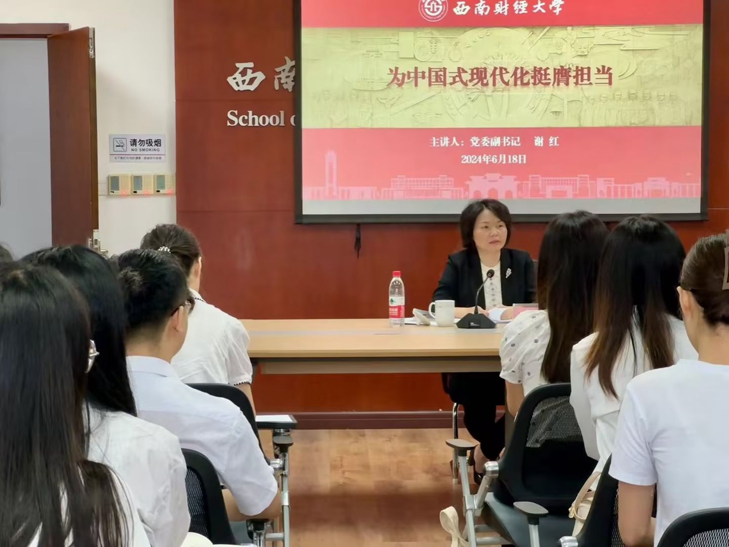 6月18日上午,太阳成集团tyc234cc党委副书记谢红在格致楼811会议室为2024届毕业生讲授专题思政课。活动由公司党委副书记王隆庆主持,公司毕业生代表和辅导员代表参加。