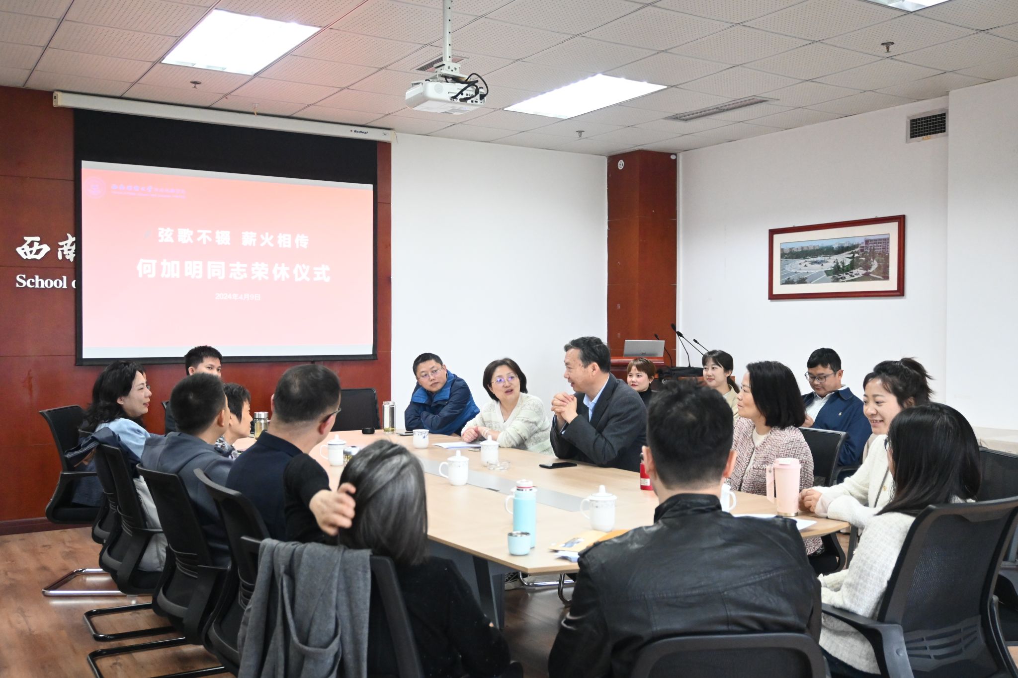 光阴荏苒,弦歌不辍。2024年4月10日,太阳成集团tyc234cc举行何加明教授荣休仪式。公司党委书记吴春力,副经理李建军,副经理吕敏,党委副书记王隆庆,教授委员会主席刘蓉,系所负责人,教师代表,行辅人员代表参加了荣休仪式。仪式由吴春力主持。