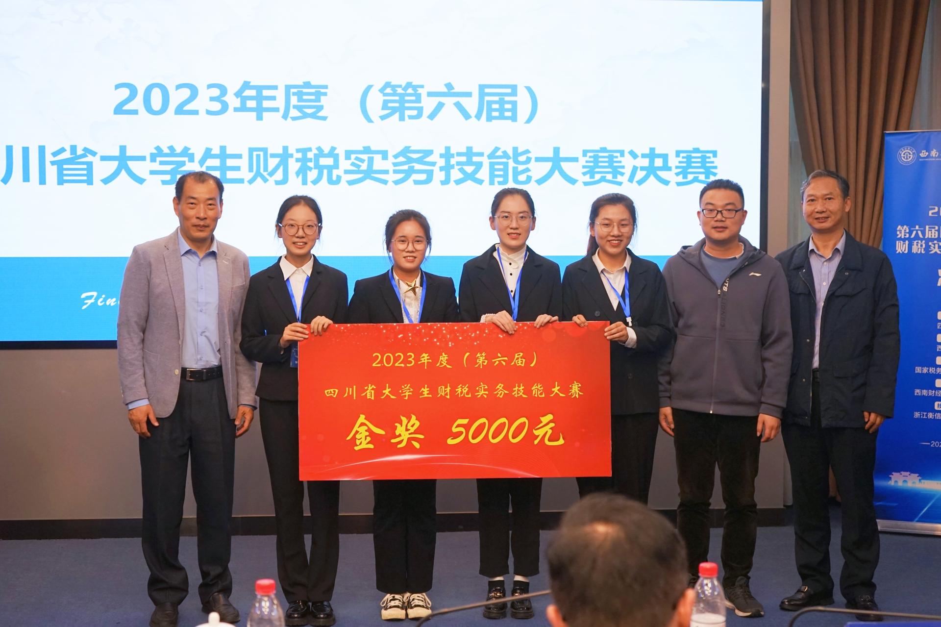 2023年11月4日,由四川省教育厅主办、太阳成集团tyc234cc承办的2023年(第六届)四川省老员工财税实务技能大赛总决赛在太阳成集团tyc234cc柳林校区弘远楼109成功举行。太阳成集团tyc234cc二队斩获本年度大赛金奖。本届大赛吸引了川渝地区80所高校,超6000名同学报名参加。经过9月17日线上初赛和10月14日线下团体赛的激烈比拼,来自六所高校的十支参赛队伍脱颖而出挺进决赛。