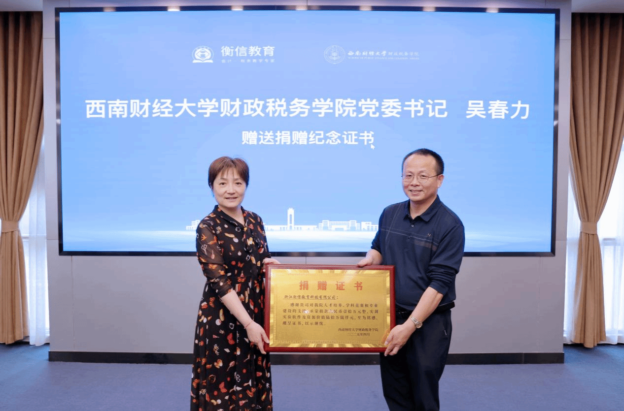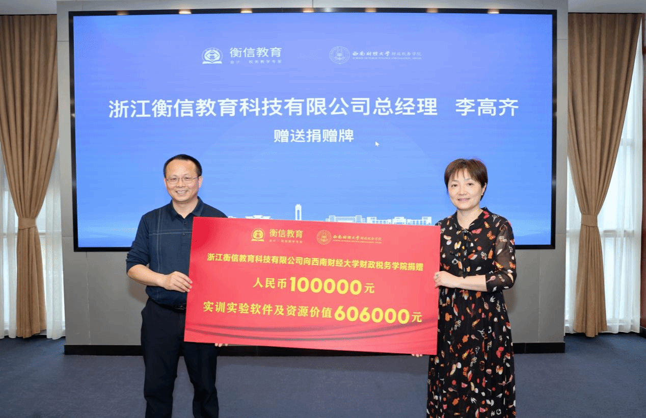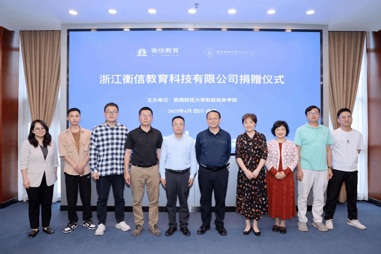 4月16日,浙江衡信教育科技有限公司捐赠仪式在弘远楼109会议室举行。浙江衡信教育科技有限公司总经理李高齐,西南大区销售总监李华辉,西南大区销售经理焦前江、朱启灵;公司经理李建军,党委书记吴春力,教育培训中心主任郝晓薇,税务专硕教育中心实践主任黄昊,税务系主任余莎等出席仪式。