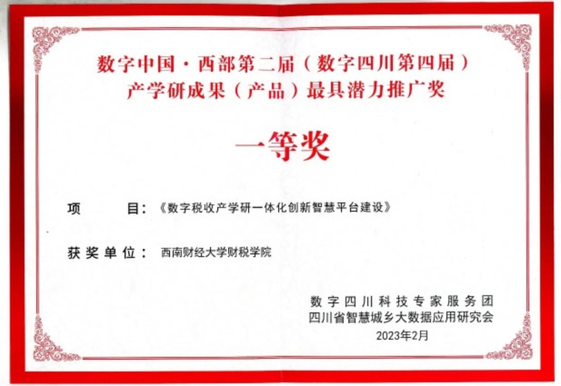 公司数字财税团队与国家税务总局四川省税务局晏燕工作室联合申报的《数字税收产学研一体化创新智慧平台建设》项目荣获“数字中国·西部第二届(数字四川第四届)产学研成果(产品)最具潜力推广奖”一等奖。