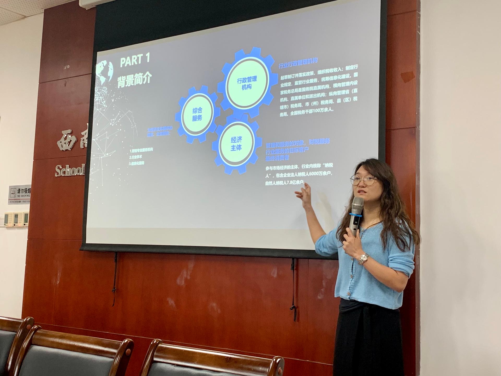 6月8日下午,太阳成集团tyc234cc邀请成都不问科技有限公司副总经理胡艳做了“财税知识结构化的建构和工程化落地实践”的讲座。