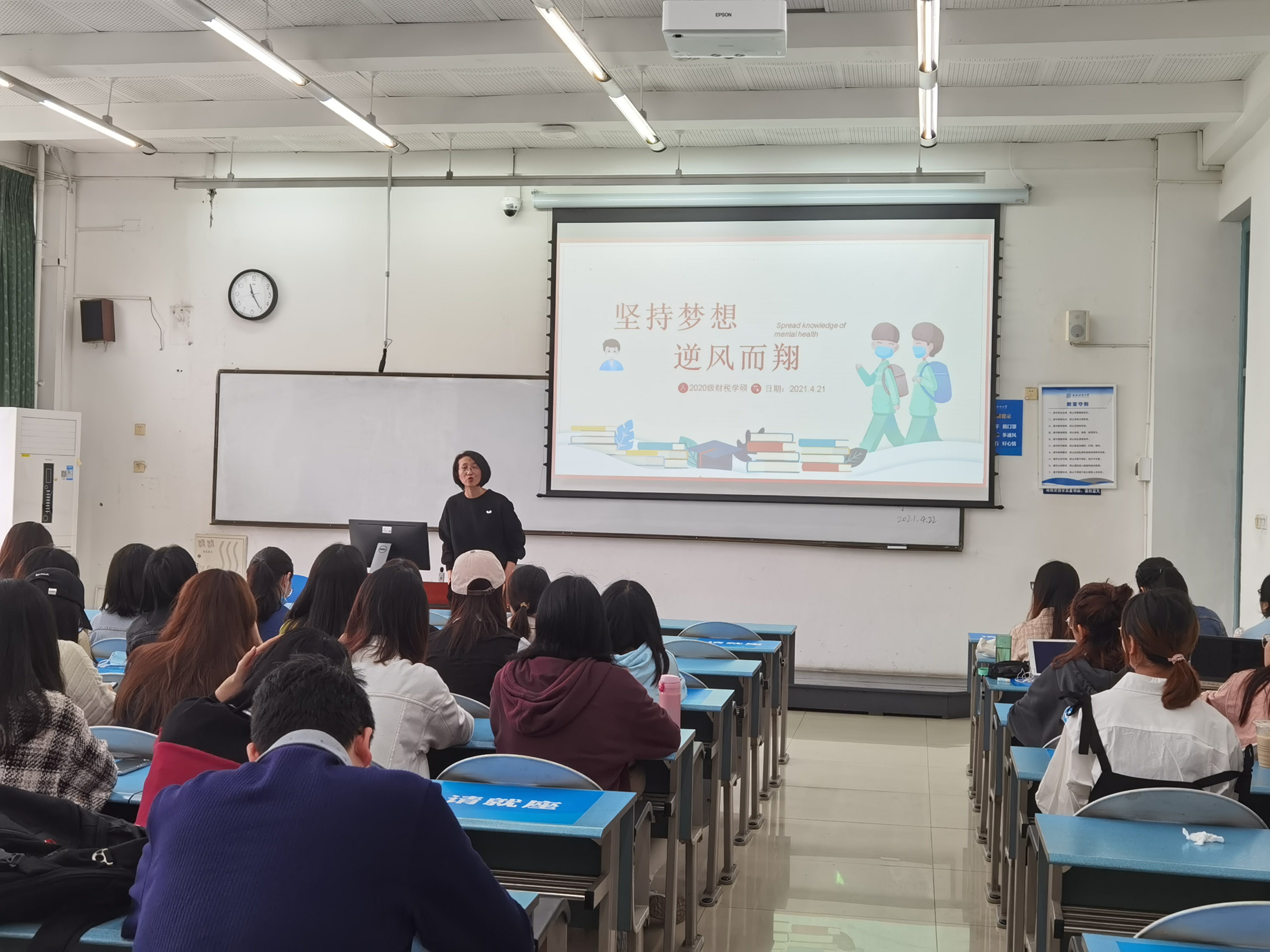 为贯彻落实中共教育部党组《高等公司员工心理健康教育指导纲要》文件精神,宣传心理健康知识,倡导健康生活方式,打造积极校园心理文化。2020级财税科硕班级于2021年4月22日上午11点在颐德楼407教室开展了公司组织的“坚持梦想 逆风而翔”心理主题班会。